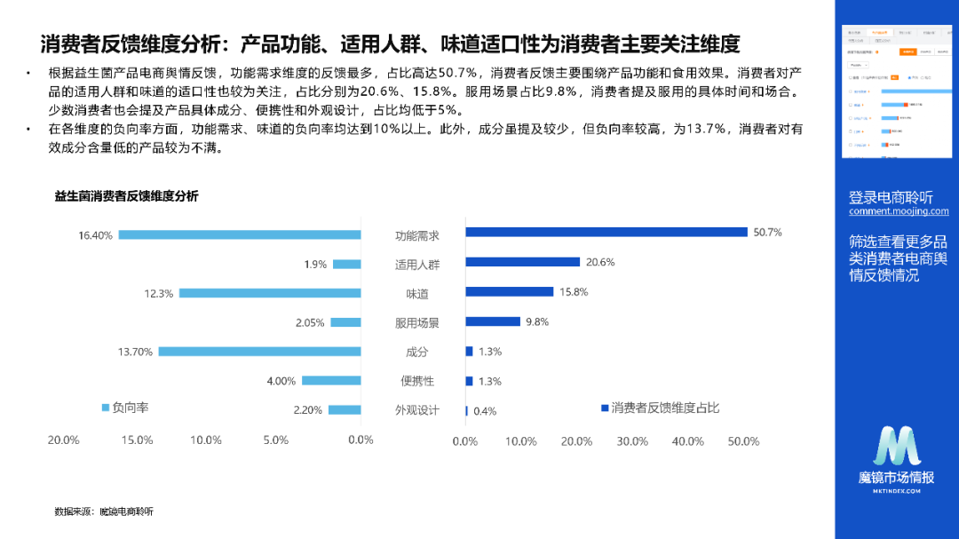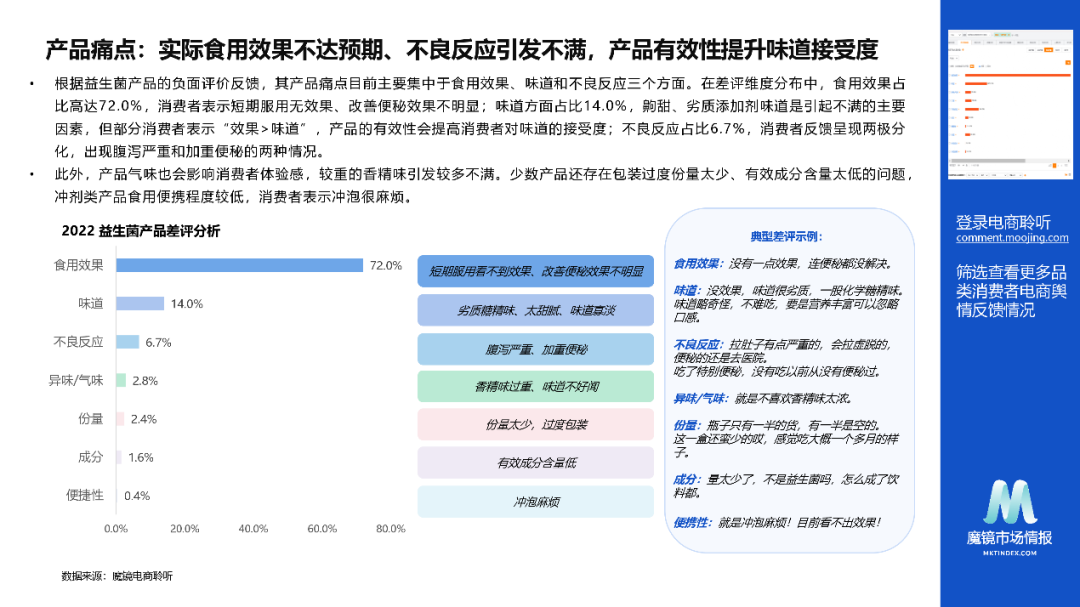 3.益生菌产品痛点:实际食用效果不达预期、不良反应引发不满,产品有效性提升味道接受度。