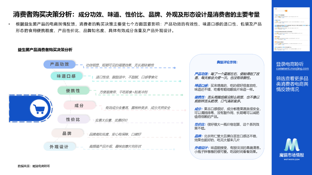 根据益生菌产品的电商舆情反馈,消费者的购买决策主要受七个方面因素影响: