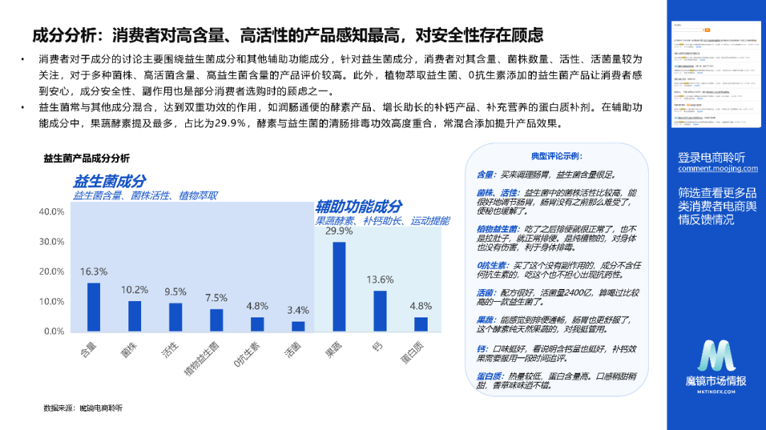 针对益生菌成分,消费者对其含量、菌株数量、活性、活菌量较为关注,对于多种菌株、高活菌含量、高益生菌含量的产品评价较高。此外,植物萃取益生菌、0抗生素添加的益生菌产品让消费者感到安心,成分安全性、副作用也是部分消费者选购时的顾虑之一。