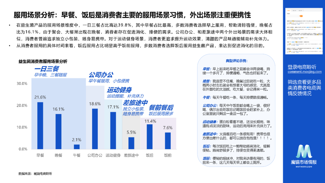(5)服用场景分析:早餐、饭后是消费者主要的服用场景习惯,外出场景注重便携性