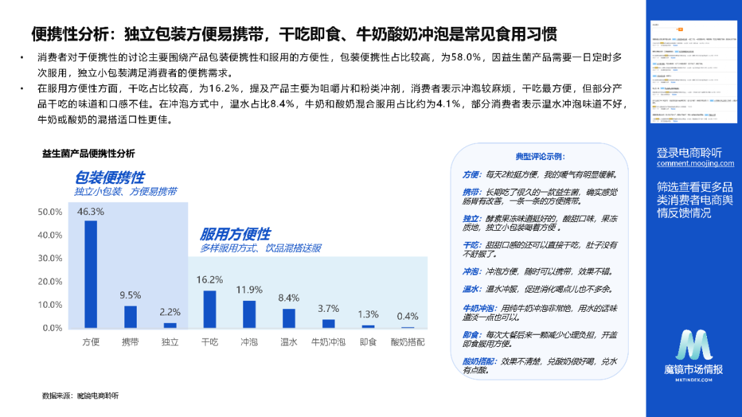 消费者对于便携性的讨论主要围绕产品包装便携性和服用的方便性,包装便携性占比较高,为58.0%,因益生菌产品需要一日定时多次服用,独立小包装满足消费者的便携需求。