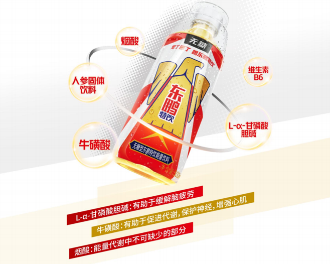 其次在成分教育方面。不少消费者对于复合能量成分(比如,牛磺酸、L-α-甘磷酸胆碱、人参粉等)的协同作用缺乏直观感知,对创新成分完全陌生。也就是说,东鹏必须打破创新成分的认知门槛,将专业的生化术语“翻译”成大众易于理解的消费语言。