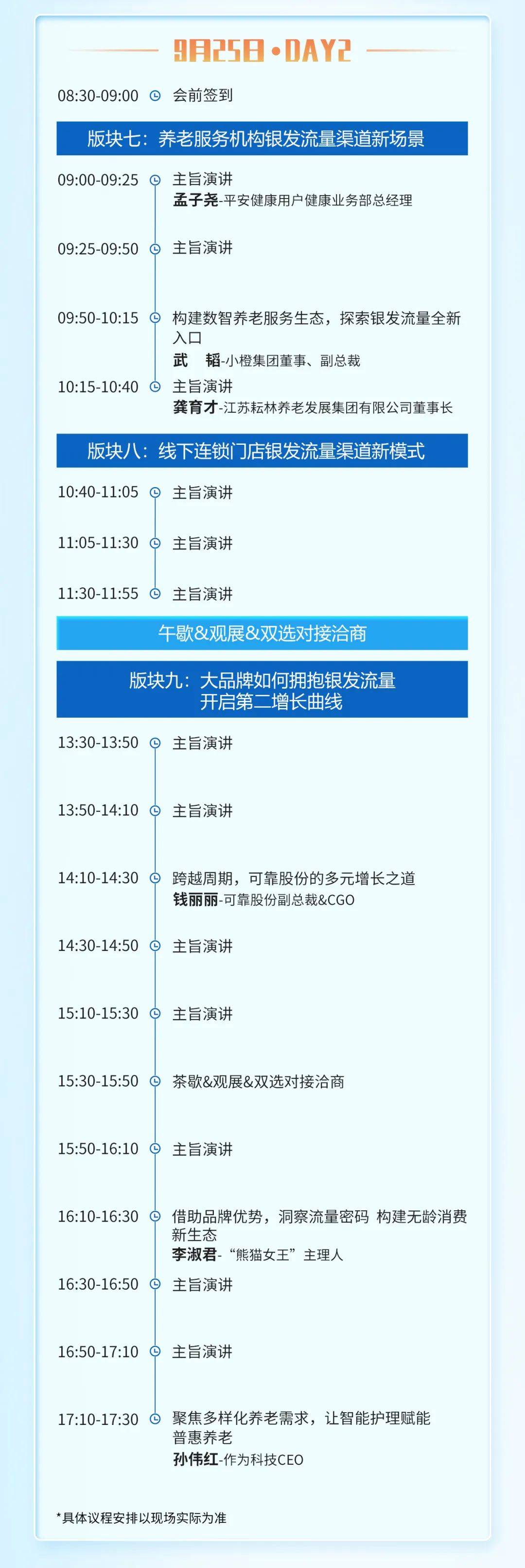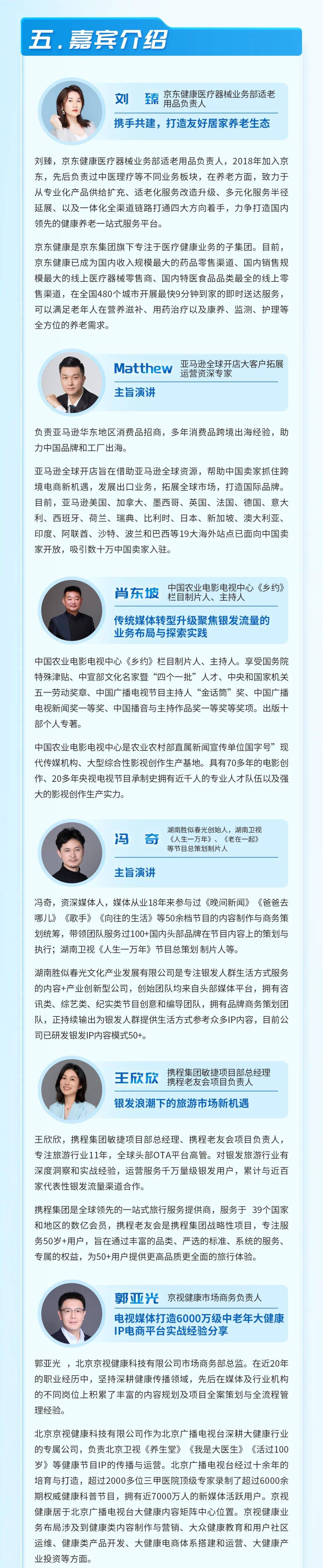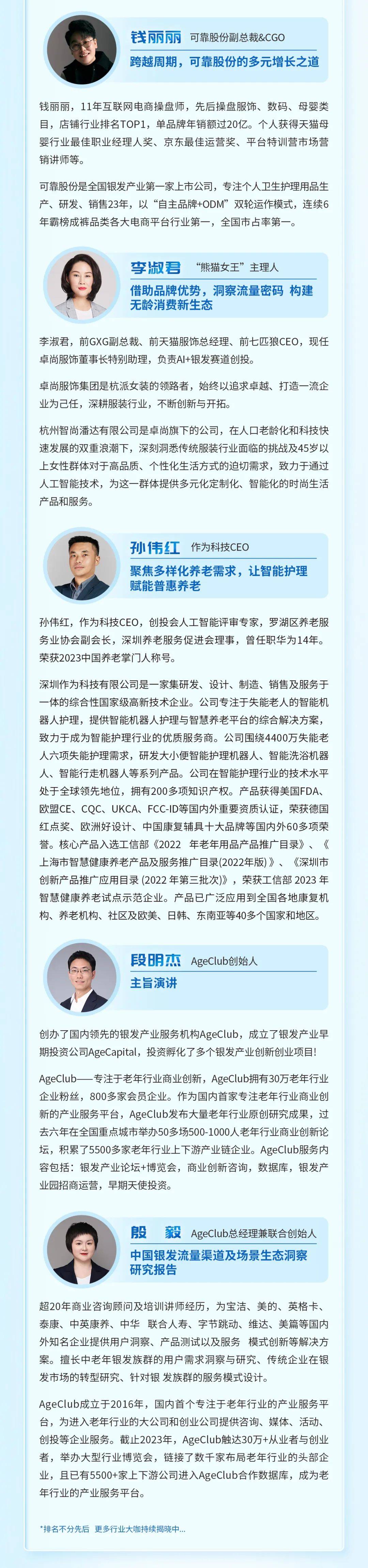 已确认出席大会演讲嘉宾有:京东健康医疗器械业务部适老用品负责人、亚马逊全球开店大客户拓展运营资深专家、《林烧养老》主理人、《50岁我想说》创始人、银彩创始人、京视健康市场商务负责人、携程老友会项目负责人、小橙集团董事&副总裁、江苏耘林养老发展集团有限公司董事长、可靠股份副总裁&CGO、“熊猫女王”主理人、作为科技CEO、平安健康用户健康业务部总经理、中国农业电影电视中心《乡约》栏目制片人 等14+行业大咖!期待来现场交流共创!