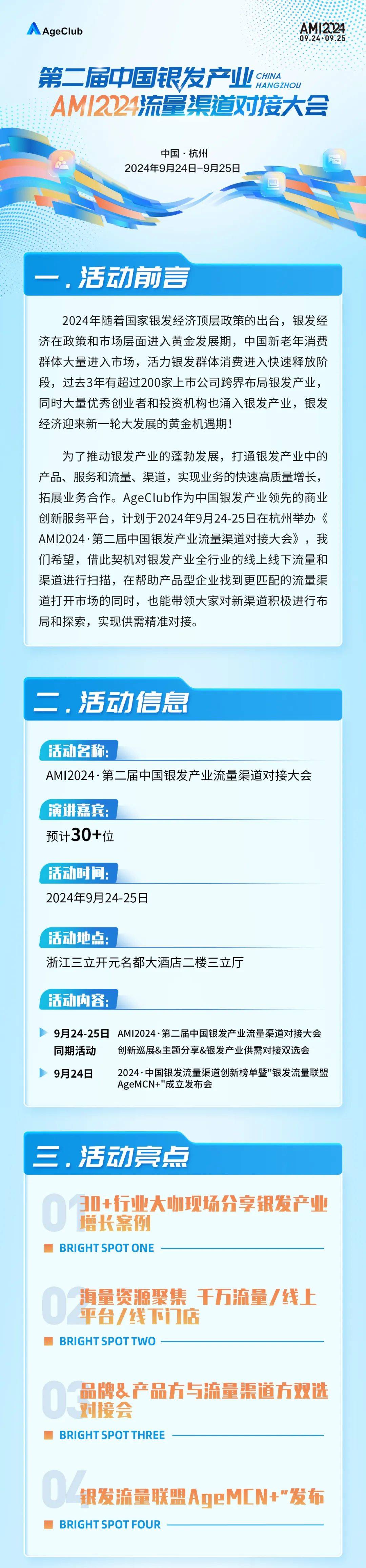 9月24-25日 AgeClub将在杭州举办《AMI2024·第二届中国银发产业流量渠道对接大会》。