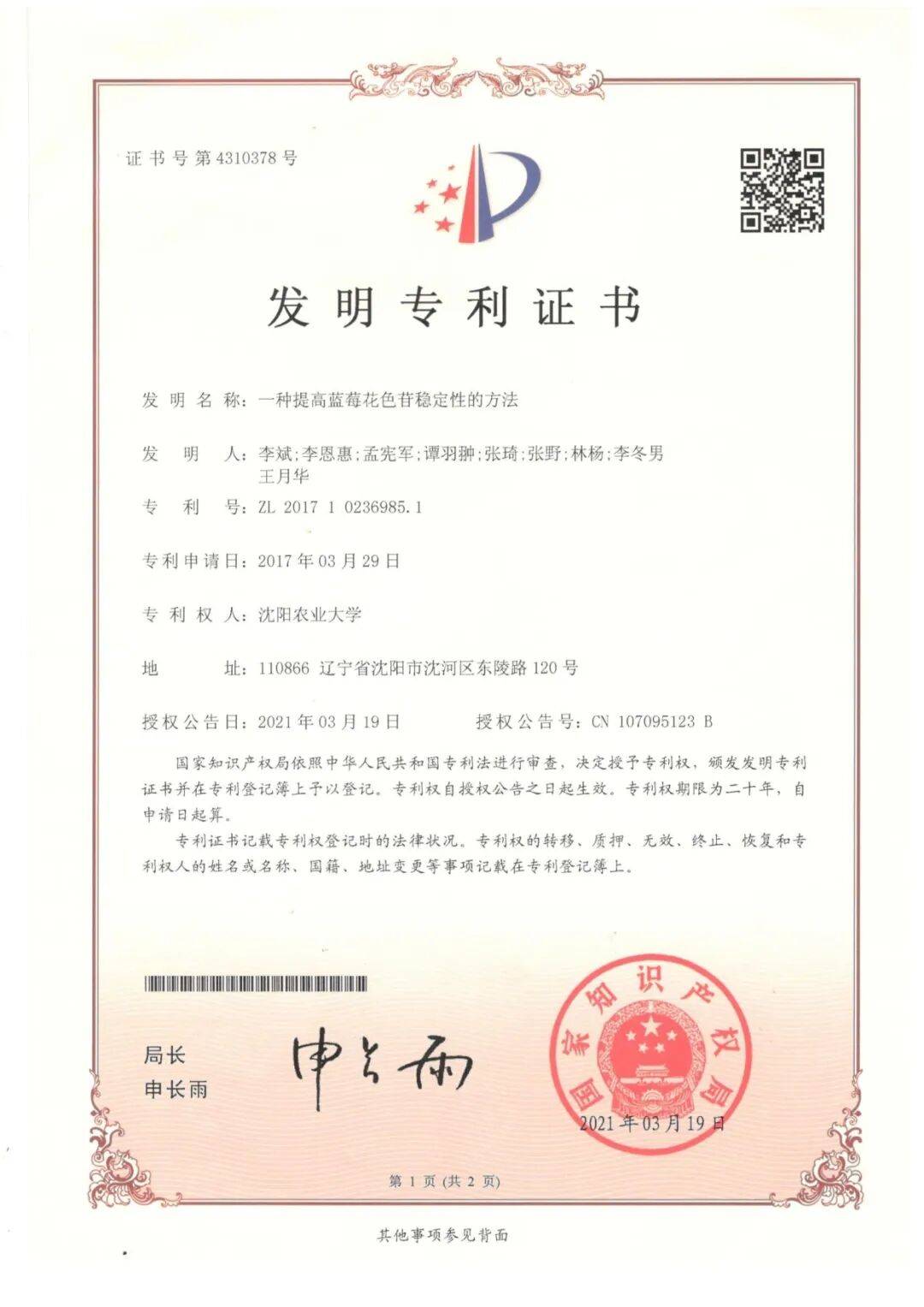 发明名称:一种提高蓝莓花色苷稳定性的方法;专利号:ZL201710236985.1