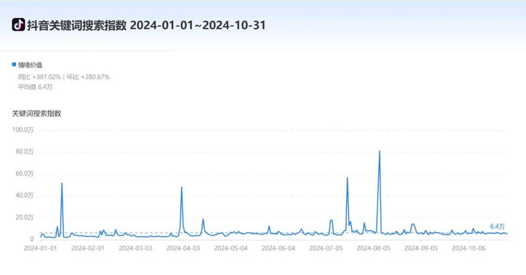2024年1-10月,抖音平台关于“情绪价值”的搜索指数平均值为6.4万;同比增长近400%;环比增长280.67%;在2023年,该数值仅为1.6万。