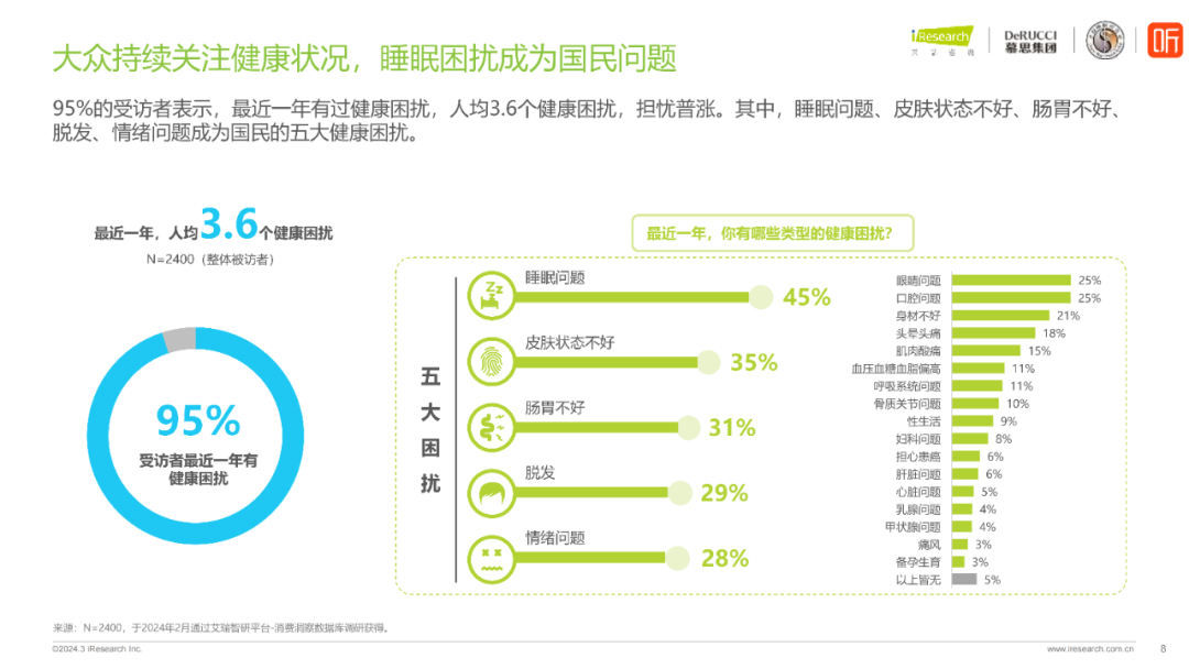 艾瑞咨询发布的《2024情绪与健康睡眠白皮书》中提到,对于国人近一年健康困扰调查中,睡眠、皮肤、肠胃等问题之外,情绪问题成为了国人健康困扰之一,排在第五位,超过了眼睛、口腔、肌肉酸痛、呼吸以及关节等问题。68%的受访者表示存在情绪困扰,轻度情绪困扰人群占比43%,中度占比19.5%。