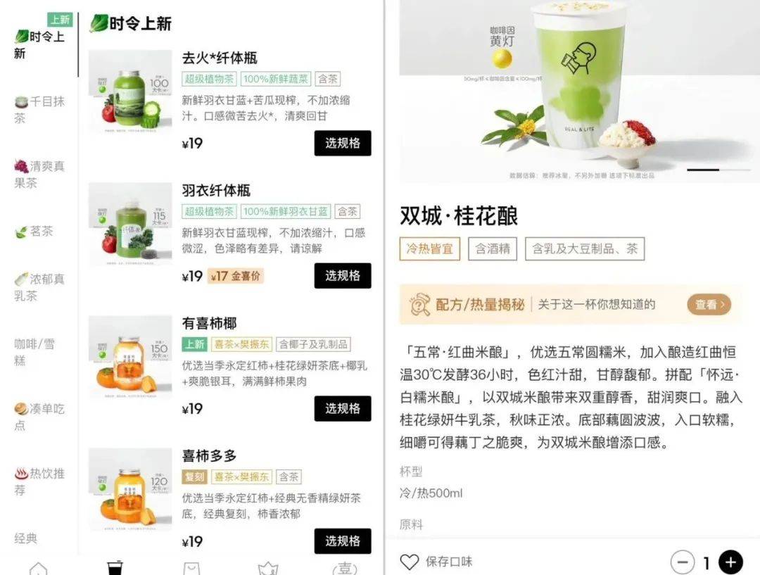 目前去其小程序点单,能看到排最前面的是“时令上新”,包含2款超级植物茶、2款喜柿系列、还有一款双城·桂花酿,也是秋季应景的产品。