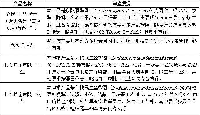 终止审查中,富谷胱甘肽酵母以食品管理,吡咯并喹啉醌二钠盐(PQQ)和以往批准的实质等同,梁河滇皂荚被认定为地方特色食品。