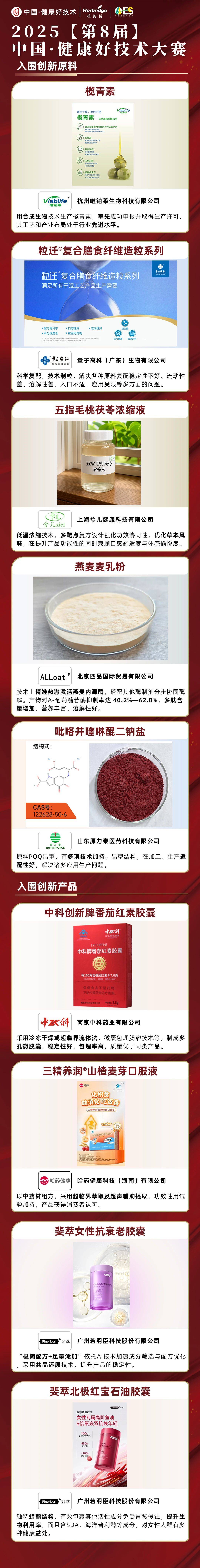 2025【中国·健康好技术】全新开创了双奖机制,分别是:营养素技术创新奖 & 药食同源技术创新奖。 立足于产业发展趋势,从主流领域代表性方向出现,通过双奖机制的划分,更垂直精准发掘营养健康产业中各个细分方向的产业核心技术缔造者。 以市场化思维、专业洞见和消费者语言,帮助产业核心技术企业提升“话语权”,将高精尖的技术升级为“消费者听得懂的方式”表达传播,赋能企业核心竞争力夯实与差异化的落地。 赛事7月入围名单新鲜出炉,诚邀更多营养健康产业上下游具有核心技术的企业参选。 此次入围的创新原料与创新产品,凭借前沿技术与创新点,展现了健康领域在原料研发与产品升级上的突破成果。从合成生物技术驱动的原料创新,到先进工艺赋能的产品升级,均凸显了行业在技术应用与功效提升上的不懈探索。 01 入围创新原料名单&创新产品名单 03 【中国·健康好技术】评选活动 奖项设置 20+奖项,解锁营养健康产业创新密码! 参评企业要求 哪些企业可以参选? 大健康领域的原料企业、品牌、代工及院校、包装、设备等供应商,均可参选【中国·健康好技术】。 食品原料类企业,如D-阿洛酮糖等代糖、药食同源及提取物、蛋白质原料、脂肪替代、营养强化剂、HMO、益生元和益生菌、添加剂等生产企业。 终端产品企业,如生产糖果、饮料、休闲食品、膳食补充剂、保健食品、食药物质等上市产品开发企业。 评委阵容 评委包括品牌端评委、CDMO端评委、药食同源评委、渠道端评委、产业专家评委、植提桥评委,6大类型评委;不同领域的头部企业专家代表,他们以多元化的视角和丰富的行业经验,为赛事的评审工作提供坚实保障。 04 报名方式 拓展阅读: END 温馨提示: 亲爱的朋友们,公众号推送机制发生改变,进入植提桥公众号主页,设置星标,及时收获新鲜推文,与行业共同进步,不掉队。