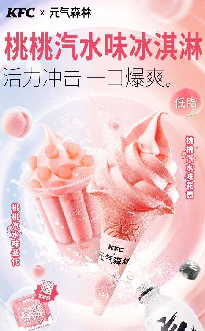 今年5月,肯德基与元气森林联名推出桃桃汽水味圣代、花筒和K飓风。该款冰淇淋为元气森林白桃苏打气泡水口味,主视觉为桃子一样的粉色,低脂清爽,还搭配了桃子味跳跳糖,增加产品口感层次。