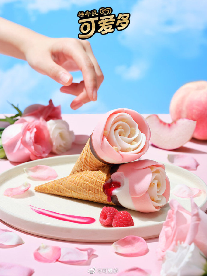 今年初,可爱多推出特牛乳冰淇淋玫瑰花榛心玫瑰白桃口味,产品添加了35%纯牛乳,外观上采用双色冰淇淋玫瑰顶花,双色双味,顶花上洒有榛子碎,冰淇淋中心夹有树莓流心酱。