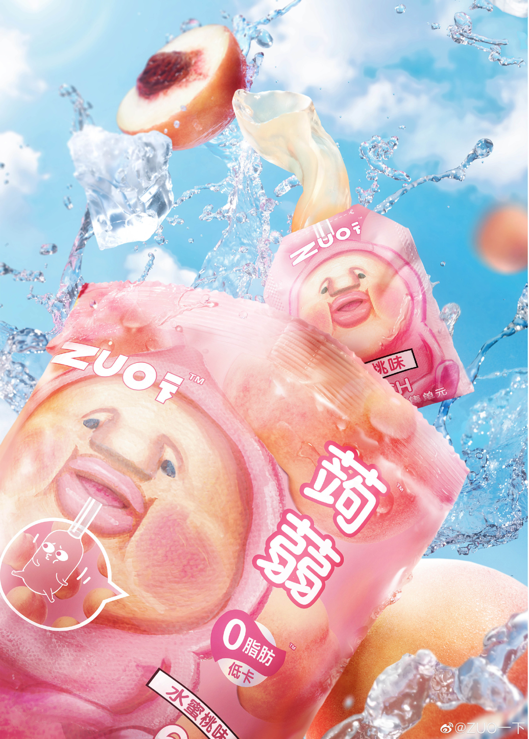 ZUO一下水蜜桃味蒟蒻果冻添加有46%的蜜桃汁和12%的苹果汁,用赤藓糖醇代替白砂糖,0脂肪,低热量,还添加有魔芋粉和白芸豆提取物。包装上采用易撕小袋装,便于携带和食用。