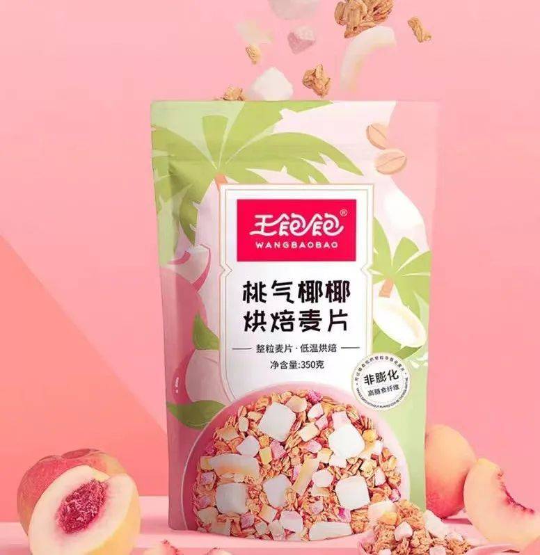 王饱饱桃气椰椰烘焙麦片采用由慢烤烘焙工艺制成的椰香烤燕麦,整粒燕麦保留完整膳食纤维,内含冻干水蜜桃丁和冻干黄桃丁,还添加了冻干糯米椰汁块和椰子脆片。