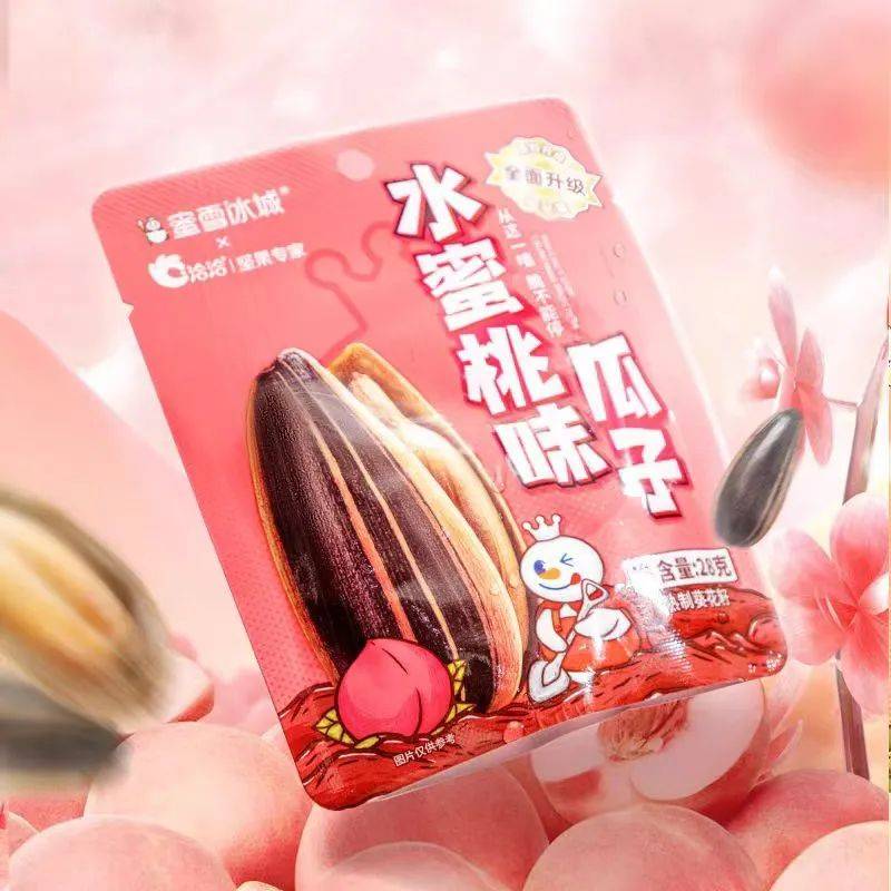 蜜雪冰城推出水蜜桃味瓜子,添加有水蜜桃汁,选用363葵花籽,小包装易于携带。