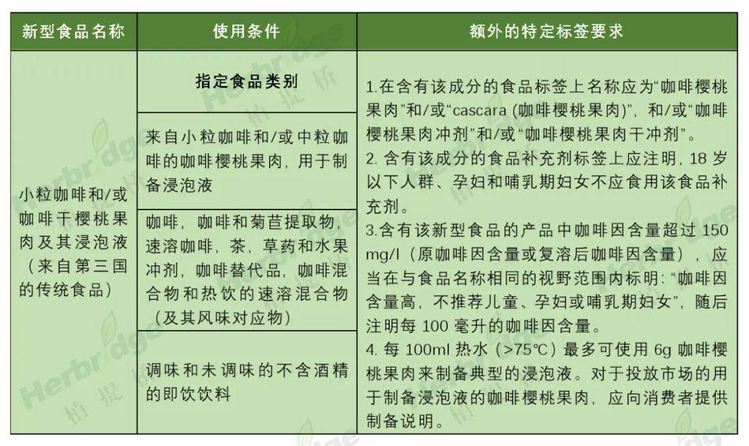 根据修订的欧盟委员会条例(EU)2017/2470,对小粒咖啡和/或咖啡干樱桃果肉及其浸泡液的要求如下: