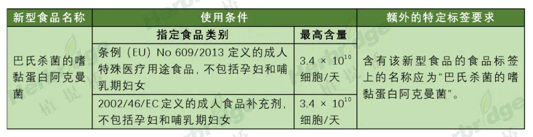 根据修订的欧盟委员会条例(EU)2017/2470,涉及“巴氏杀菌的嗜黏蛋白阿克曼菌”修订内容如下: