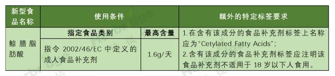 根据修订的欧盟委员会条例(EU)2017/2470,涉及“鲸腊脂肪酸”修订内容如下: