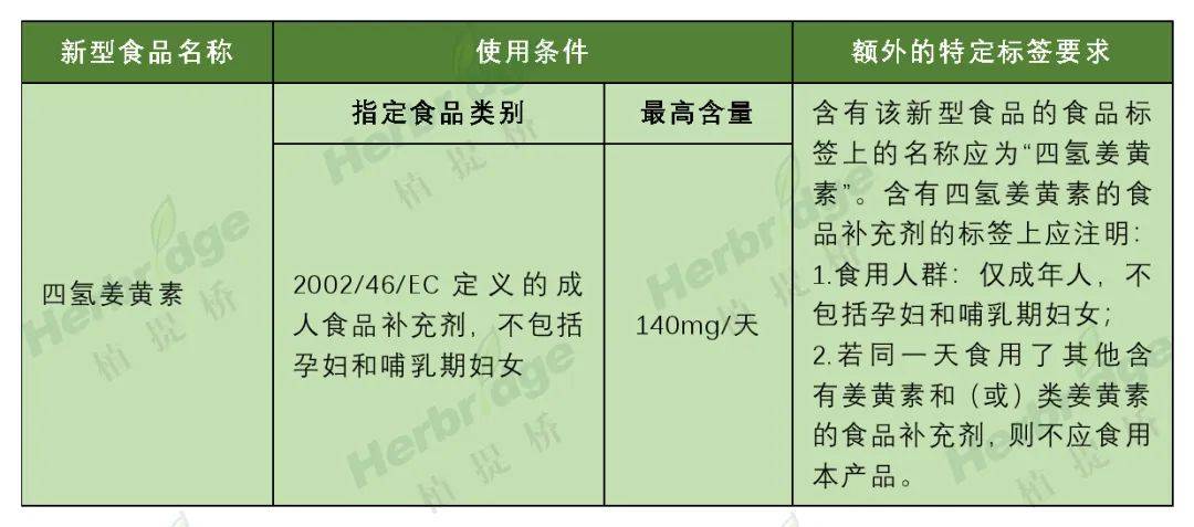 根据修订的欧盟委员会条例(EU)2017/2470,涉及“四氢姜黄素”修订内容如下: