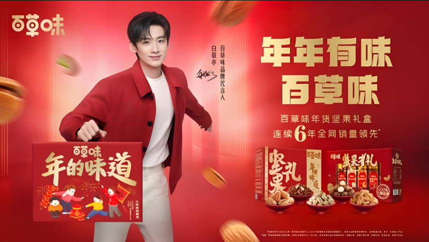 这一决策使其在电商红利期迅速积累用户和品牌认知,奠定了互联网基因的基础。百草味早期尝试微博、微信等社交平台营销,积累私域流量,为后续全渠道布局奠定基础。在粉丝受众上,百草味将年轻消费者作为主要目标群体,全力打造品牌年轻形象。百草味不仅邀请杨洋、易烊千玺等顶流明星代言,提升品牌年轻化形象;还与热门影视IP(如《三生三世十里桃花》)联名推出定制产品,借势IP热度扩大曝光;同时赞助《奇葩说》《欢乐喜剧人》等热门综艺,通过节目场景化植入强化品牌记忆点。