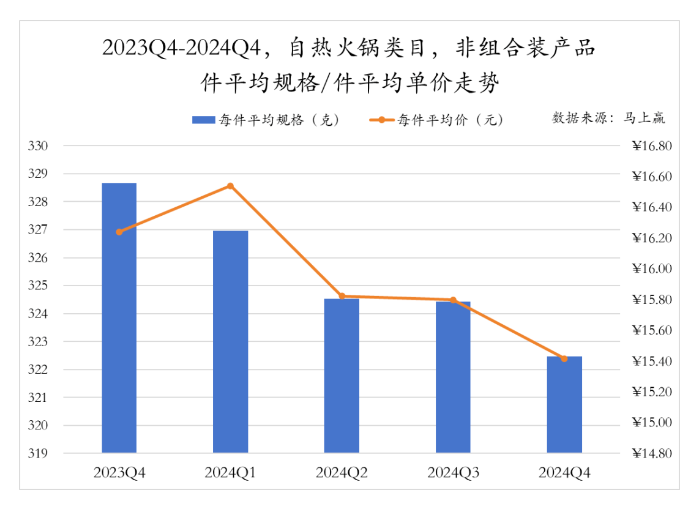 相比方便速食其他类目,自热火锅类目非组合装产品的件均规格和件平均单价均呈现出连续的下滑趋势。件平均单价方面除2024年Q1有所提升外,随后几个季度连续降低,2024年Q4跌至15.42元。在店均卖力同比变化上,自热火锅类目的表现不容乐观,所有业态店均卖力都有较大程度同比下降。除食杂店外,其余业态的店均卖力同比下降均超过20%,自热火锅各业态均面临较大市场挑战。