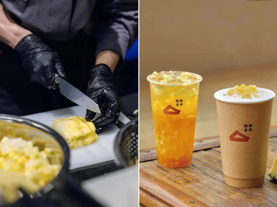 另一方面,凸显“手作果茶”的价值感。以门店热销的古法土凤梨为例,使用菲律宾土凤梨,切成颗粒熬煮成果酱,果肉混合凤梨汁制成凤梨冻,再搭配上乌龙茶与鲜牛奶,清爽之余还原经典小吃“凤梨酥”的风味。