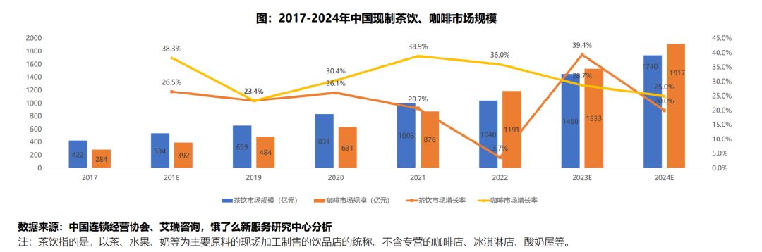 根据饿了么新服务研究中心发布的《2023中国现制茶饮、咖啡行业白皮书》,我国的茶饮市场规模已经从2017年的422亿增长到了2022年的1040亿元,年复合增长率超过20%;咖啡市场规模也从2017年的284亿元增长到了2022年的1191亿元,年复合增长率超过30%。