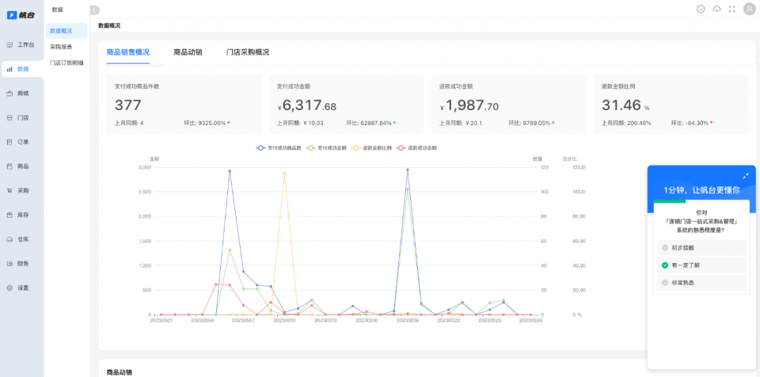 一方面,在企业的数智化管理上,帆台打造了专属品牌方的数字商城,通过全国门店统一管理方案,强化集团掌控力、提升品牌力;同时,供应链节点的数字化也提供了全渠道业务数据中台,帮助清晰地呈现全局经营数据,并由此提升数字化经营分析力,进而利用数据反哺决策,实现经营数字化、可视化、信息化。