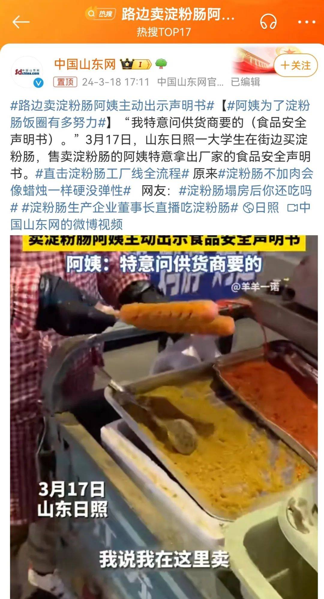 在315曝光淀粉肠事件后,微博上#老人出摊卖淀粉肠无人问津#的词条首先冲上了热搜,