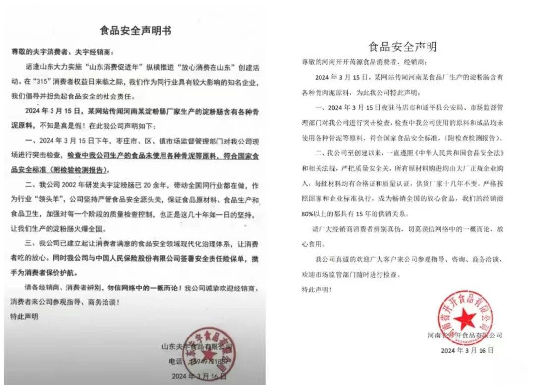 3月16日,山东夫宇食品有限公司首先反应过来,发布食品安全声明书并公开生产制作流程。声明中称经过市场监管局的突击检查,公司产品完全没有问题。随后18日,该公司在社交平台上开启了生产流程的现场直播自证,围观网友高达上万人。