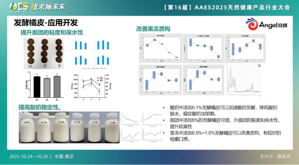 不仅如此,安琪纽特还围绕发酵橘皮面团、酸奶和果冻各个品类应用中进行了探索尝试,发现,发酵橘皮在面团的粘度、保水性和延展性的提升上有较好的表现,在加速酸奶发酵、降低酸奶脱水喝稳定酸奶的货架期有潜力;在果冻中添加,能够改善质构,带来更好的咀嚼口感。这为发酵橘皮更广阔的应用打下了坚实的基础。