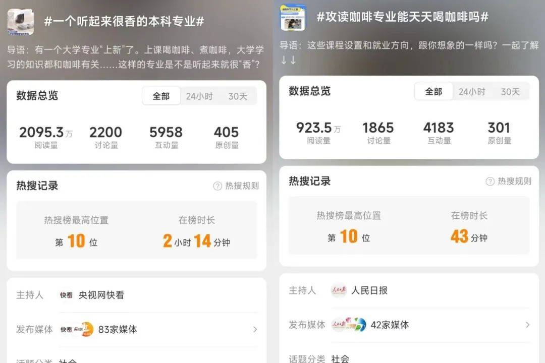 高考放榜前夕,“一个听起来很香的本科专业”“攻读咖啡专业能天天喝咖啡吗”,接连登上微博热搜,近3000万的阅读量,各大媒体争相报道。