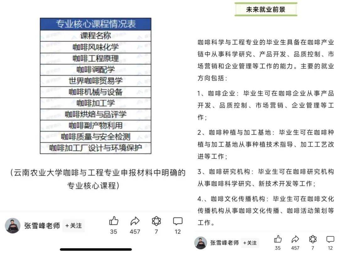 张雪峰老师微信公众号也给出建议,未来就业方向包括咖啡企业、咖啡种植与加工基地、咖啡研究机构、咖啡文化传播机构等。