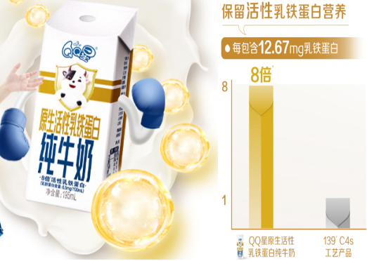 这款牛奶通过“分离提取-单独除菌-无菌回填”技术,成功保留了超过90% 的乳铁蛋白活性,是普通工艺的 8 倍之多。这项技术不仅提升了牛奶的营养价值,也让消费者以普通牛奶的价格就能享受到高端营养,质价比优势突出。