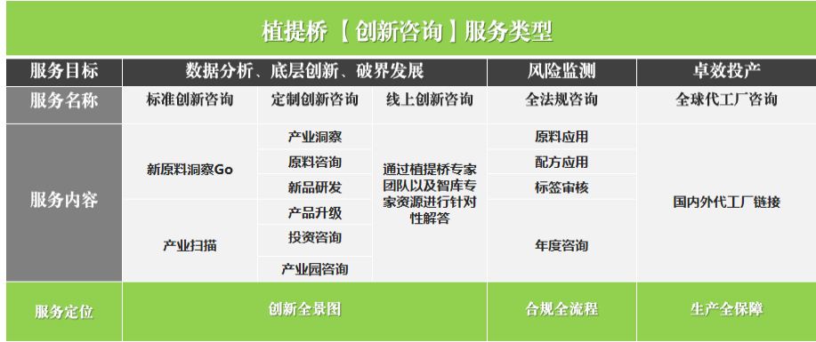 旨在向企业提供产业发展趋势、立项调研、原料/品牌咨询、新品研发/差异化定位、法规风险把控、以及全球代工链接和投融项目链接等服务。截止目前,植提桥现已收到了110+次服务咨询,以下为大家列出服务项目所包含的类型: