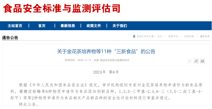 12月5日,一批“三新原料”获批:包括1种新食品原料,8种食品添加剂新品种和2种食品相关产品新品种。