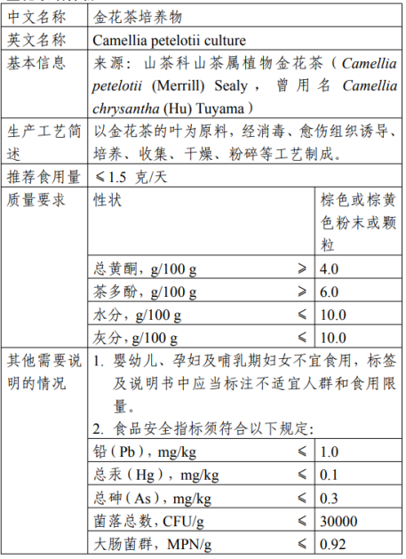 金花茶培养物是以山茶科山茶属植物金花茶(Camellia petelotii (Merrill) Sealy)的叶为原料,经消毒、愈伤组织诱导、培养、收集、干燥、粉碎等工艺制成。标志性成分是黄酮和茶多酚。
