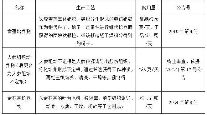 目前有3款新原料是通过组织培养技术实现在食品领域的规模化生产、供应。分别是雪莲培养物、人参组织培养物、金花茶培养物。