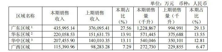 极大的提升了东鹏的品牌渗透和销售区域拓展。这一点也在财报里有所提及,在报告期内,公司主要的销售区域为广东、华东、华中、华北、广西及西南等市场,广东区域在2024 年实现营业收入 43.60 亿元,同比增长15.93%,营收占比为 27.56%。