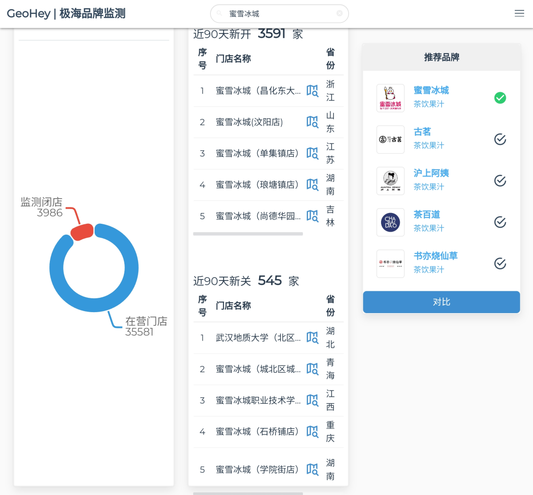 我赶紧到极海品牌监测官网上看了看,发现最新数据显示:近90天蜜雪冰城开店3581家,闭店545家。
