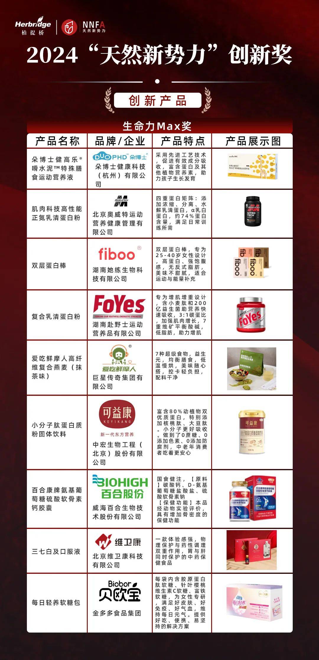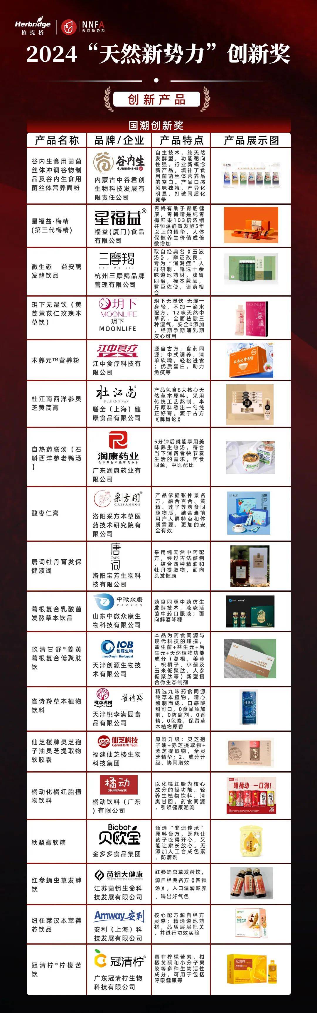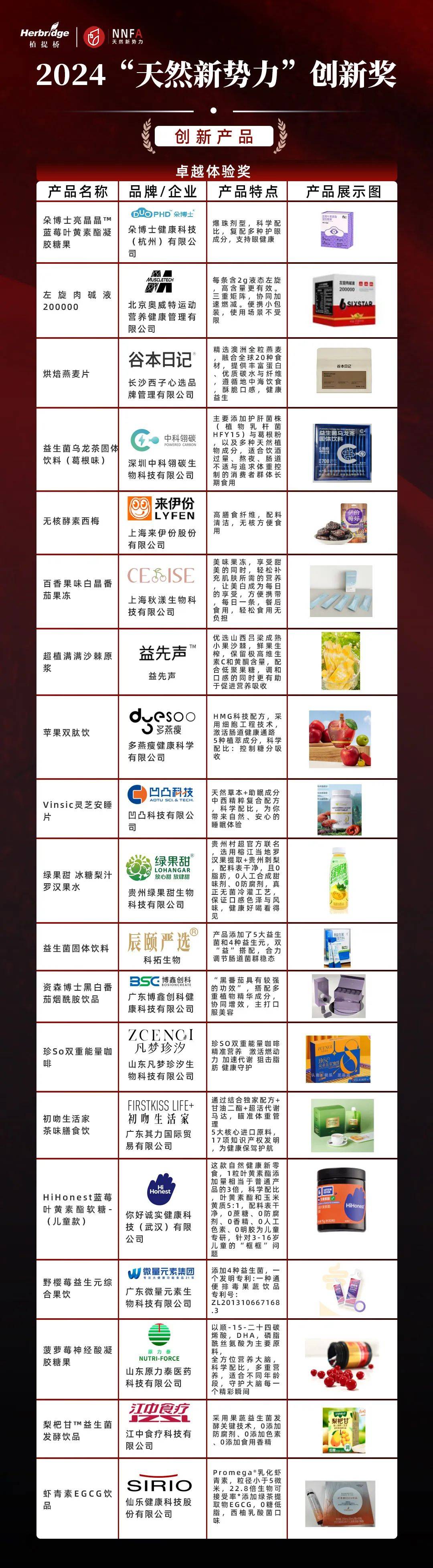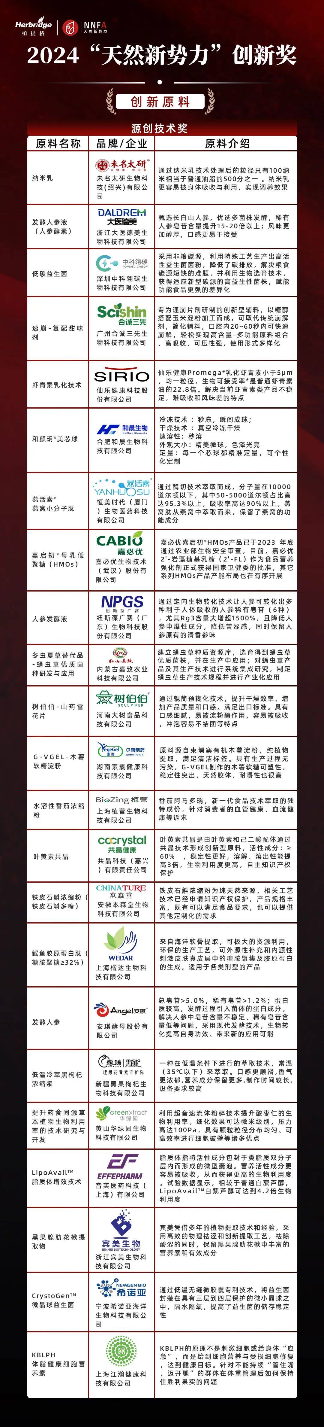 截至目前,天然新势力创新评选大赛累计参与企业1200+,发掘创新项目创新项目1900+。2024天然新势力创新评选大赛将从科学、前沿、应用等角度,对天然健康产品通过专业、独立评审的机制,找到隐藏的新星,并将为获奖企业提供创新研发、品牌推广、资源对接等多项扶持,帮助企业快速提升影响力和品牌力。