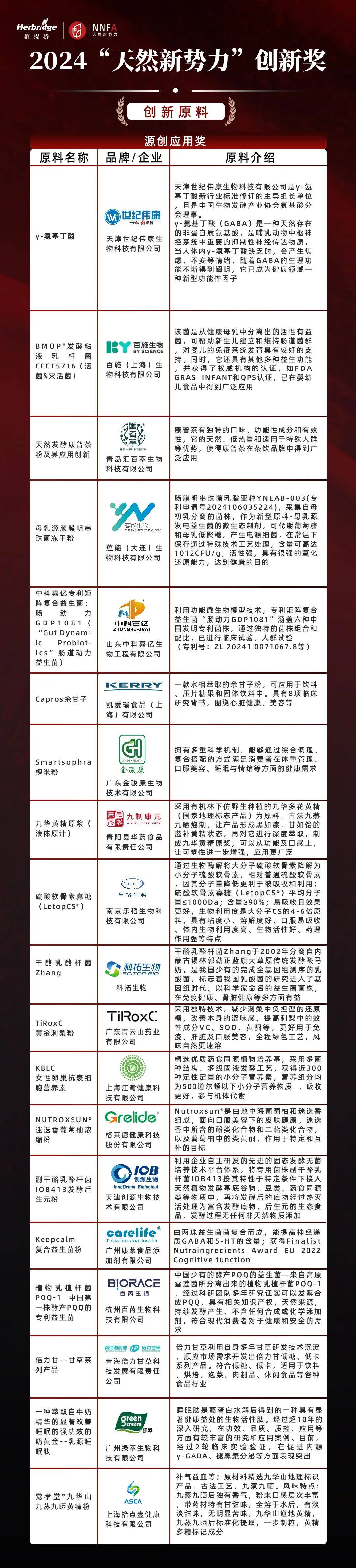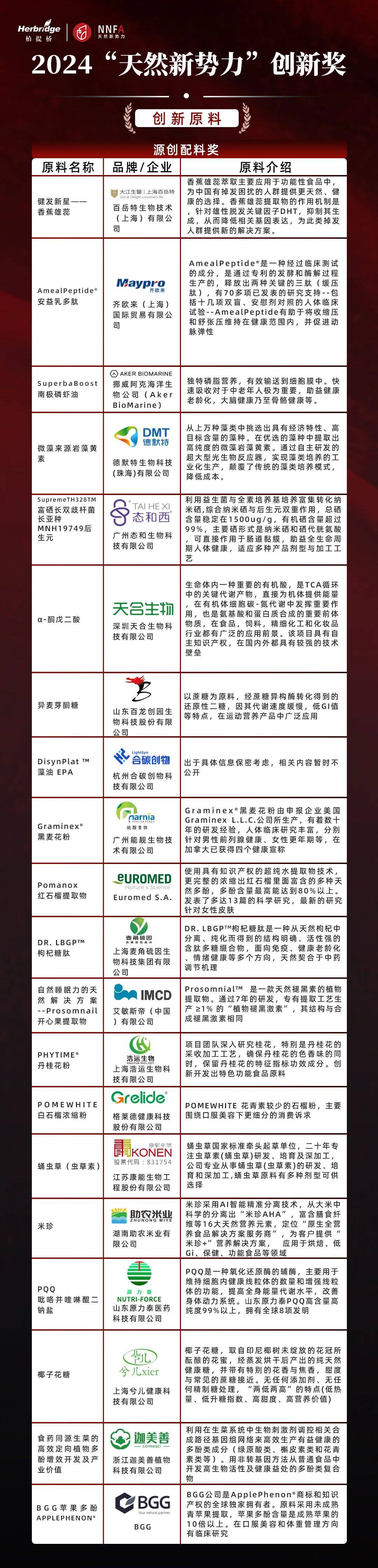 创新原料皆在突出强调提供特定的健康益处,天然成分,利用现代生物技术,来生产具有特定功能的成分。此外还强调了其安全性和有效性,突出高的质量控制和临床试验加持。