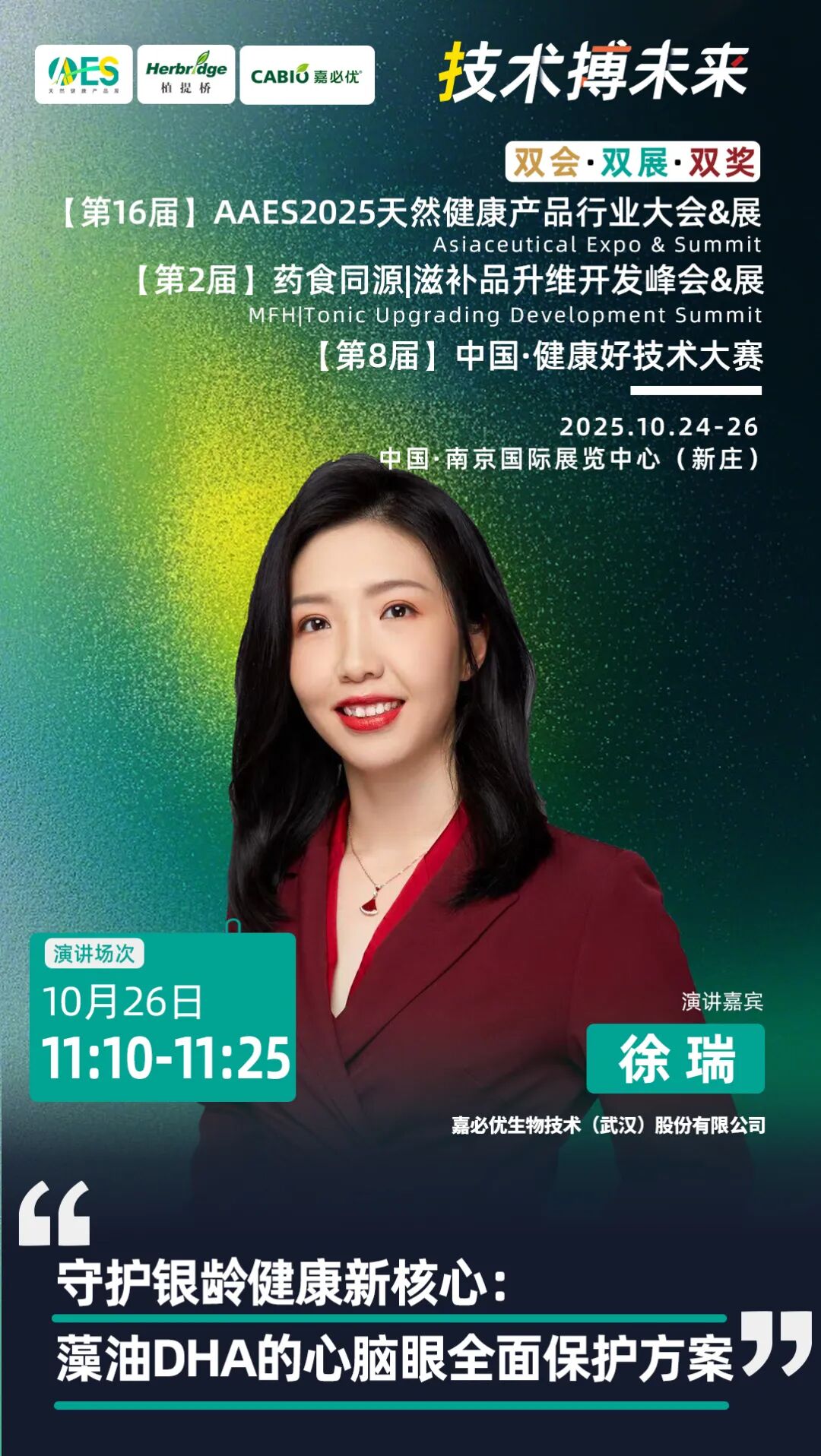 26日上午,嘉必优将在大会创新路演环节开展《守护银龄健康新核心:藻油DHA的心脑眼全面保护方案》分享活动,嘉必优海外品牌经理徐瑞将围绕全球银发经济浪潮,深度洞察国际趋势和中国市场、以中老年健康需求的多元化与精细化消费者现象,提出嘉必优的心、脑、眼三位一体的产品解决方案。