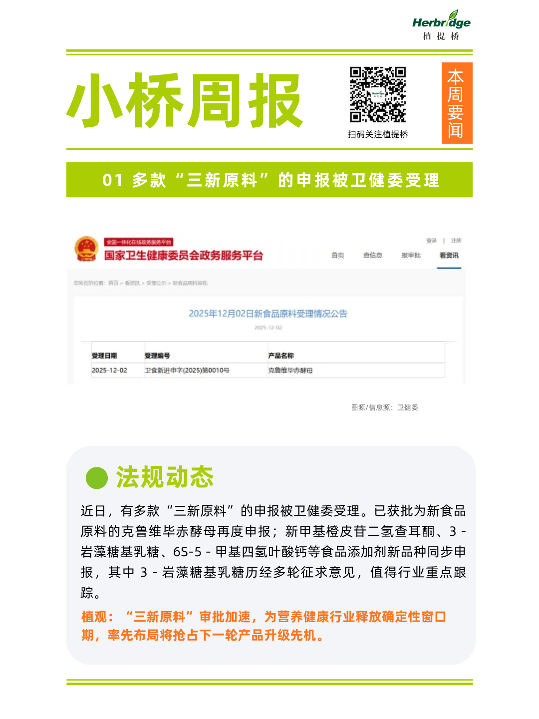 一周要闻|多款“三新原料”的申报被卫健委受理,静脉健康补充剂、眼脑新品、益生菌营养瓶上新