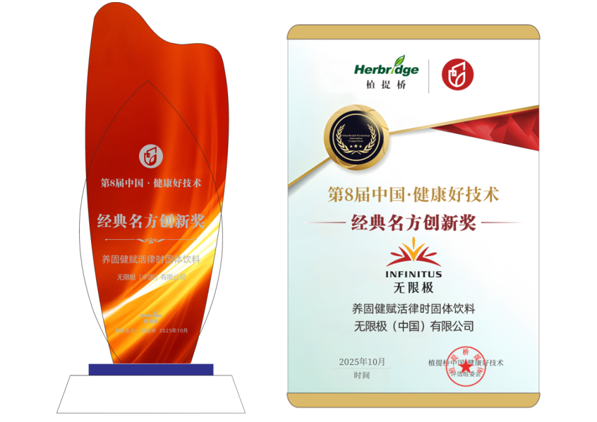 在这场聚焦营养健康产业技术巅峰的盛会中,无限极重磅新品——养固健赋活律时固体饮料,成功斩获 “产品技术创新・经典名方创新奖,用实力彰显中华养生与现代科技融合的卓越成果。