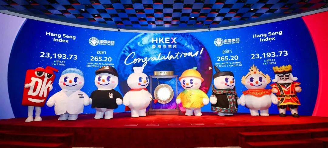 上市首日高开逾29%,每股报价262港元,总市值达987.9亿港元,其后涨幅扩大超过四成,总市值突破1069亿港元。在茶饮港股上市公司中,蜜雪集团嫣然如一批黑马,将其他品牌远远地甩在身后。