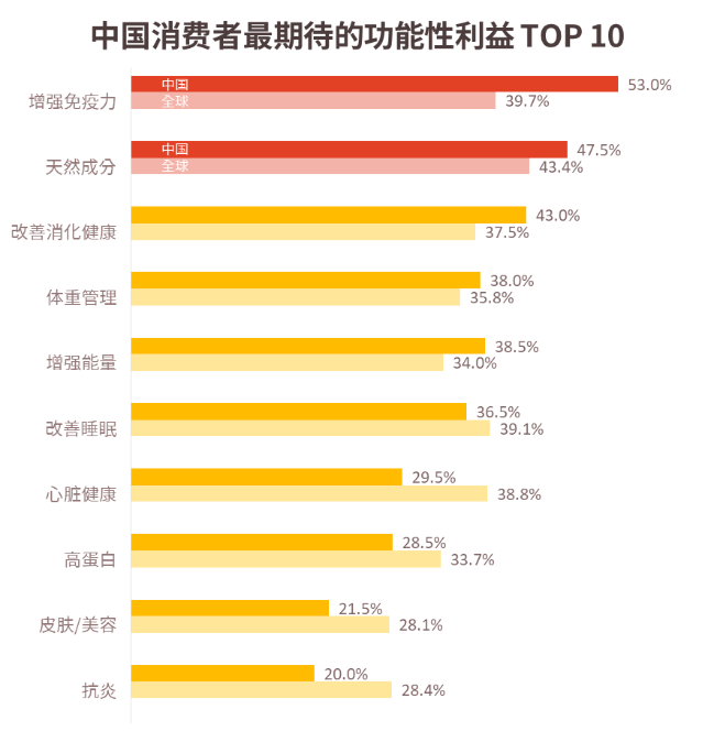“免疫健康”以53%的占比遥遥领先,比全球平均水平高出13.3个百分点。