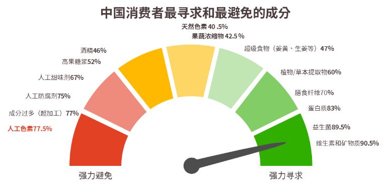在消费者寻求的食品原料方面,89.5%的中国消费者在寻求益生菌,90.5%在寻求维生素和矿物质。而在“避免清单”上,排名第一的是人工色素——77.5%的中国消费者主动避免人工色素,比全球平均高出14.6个百分点。