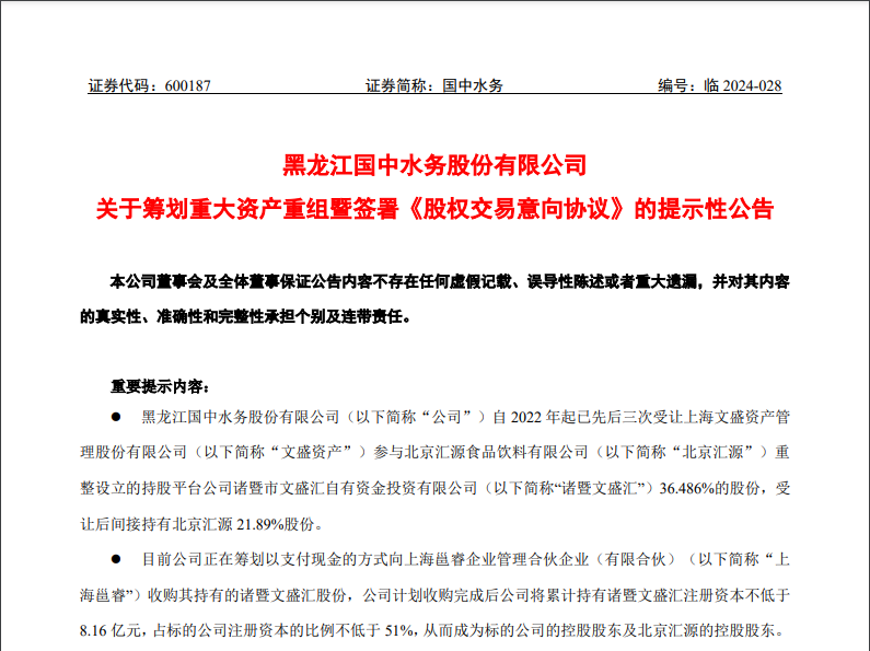 2022年12月,国中水务豪掷8.5亿元,从文盛资产手中受让诸暨文盛汇31.481%的股权,从而间接持有北京汇源18.89%股权。据了解,重整设立的持股平台公司名为文盛汇,该公司只认购法院裁定批准重整后的北京汇源60%股权,而不做其他经营业务。交易完成后,国中水务将通过文盛汇间接持有北京汇源18.89%股份。公告显示,经协商确定,北京汇源的整体股权估值为45亿元。