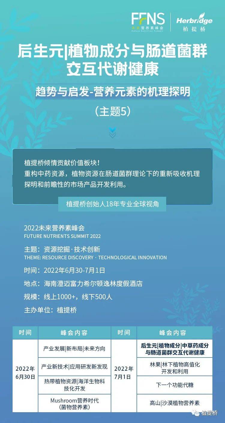 益生元、肠道健康是植提桥一直关注的重点方向,在6月30日至7月1日于海南举办的FFNS2022未来营养素峰会中特设的【后生元|植物成分|中草药成分与肠道菌群交互代谢健康】板块,将聚集国内外最新研究成果,重整中药资源、植物资源在肠道菌群理论、代谢组学、分子生物学和循证医学理论下的重新吸收、机理探明、新功能开发和前瞻性的市场产品开发利用。 如果您对该议题感兴趣,即可联系我们报名参加本次峰会。